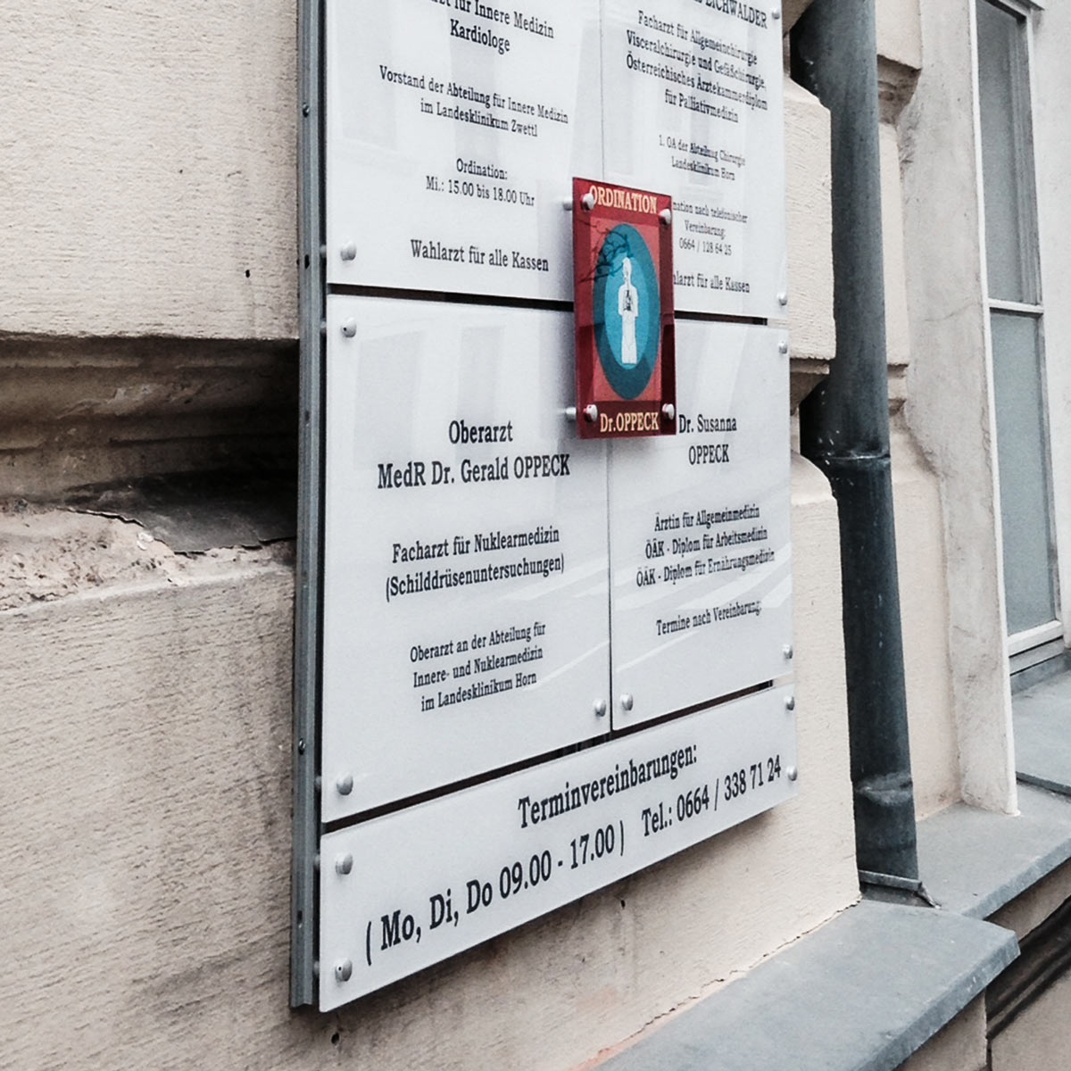Direkt bedruckte Acrylglas Firmenschilder, optional mit Weissdruck.