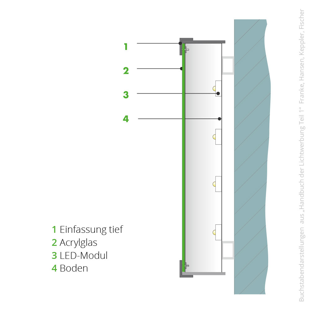 Mehrteiliger Vollreliefbuchstabe aus Aluminium. Pulverbeschichtet in Standardfarben bzw. lackiert nach RAL. Acrylglasspiegel mit frontaler Ausleuchtung mit innenliegenden LEDs gehalten von Aluminiumwinkelprofilrähmchen