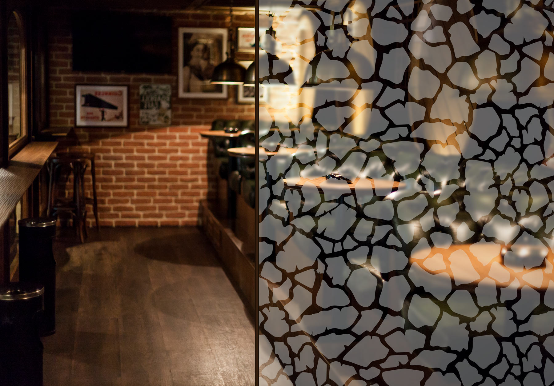 Konturgeschnittene Sandstrahlfolie mit seidenmatter, transparenter Oberfläche für die Verklebung auf Glas – vermittelt den Eindruck einer sandgestrahlten Oberfläche. Wird auch als Glasdekorfolie oder Satinatorfolie bezeichnet.