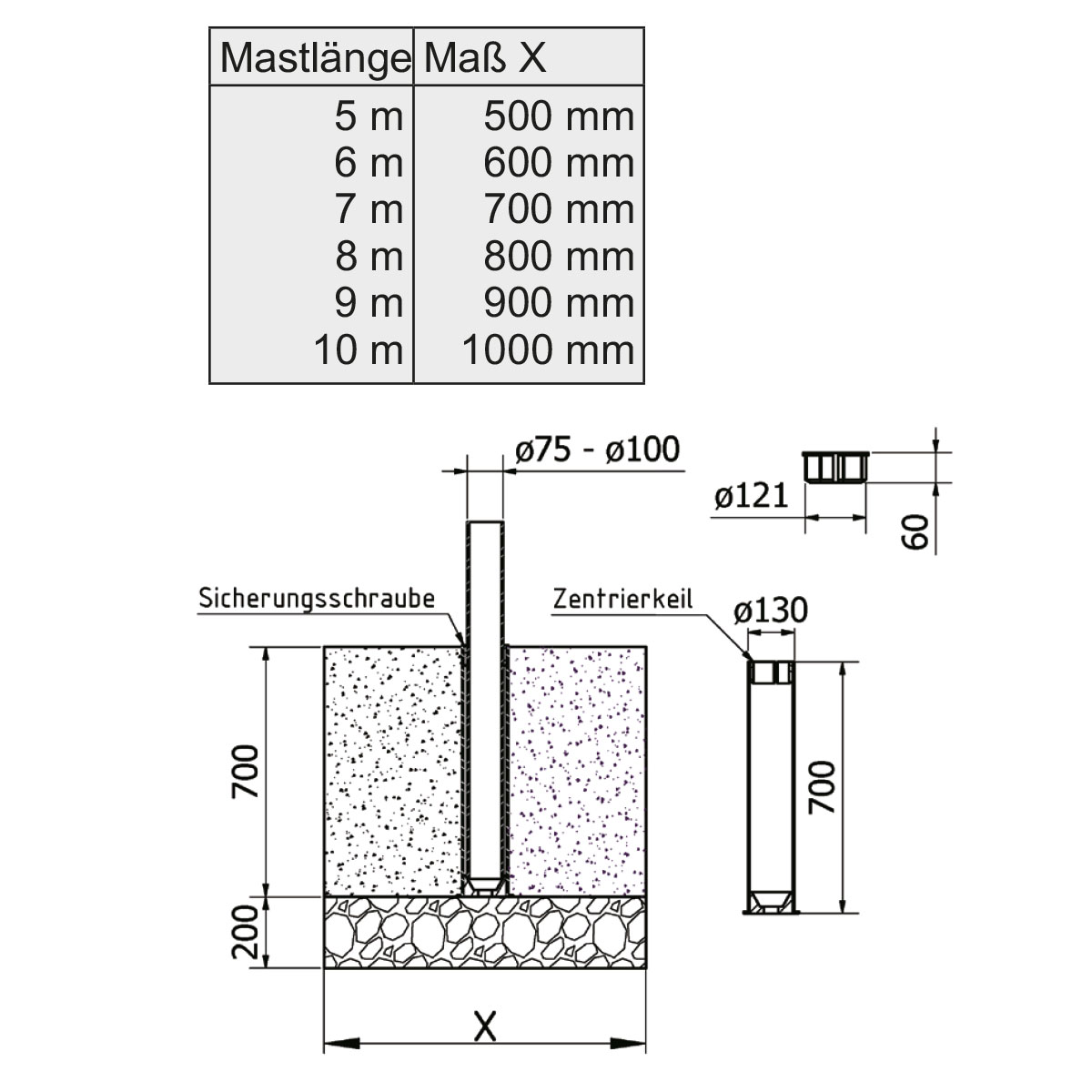 Das als Bodentrichter ausgeformte Aluminium-Rohr sowie der Kunststoff-Zentrierkeil sorgen für den festen, senkrechten Stand des Mastes, der Zentrierkeil wird mit einer selbstschneidenden Schraube gesichert, dadurch ist der Mast bereits etwas gegen Vandalismus bzw. Diebstahl geschützt.
